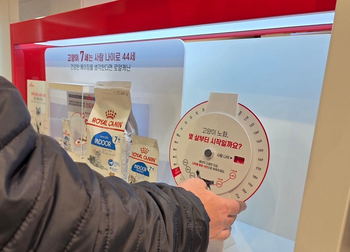 로얄캐닌 브랜드숍을 방문한 몰티즈 ‘봄이’가 다양한 강아지용 사료 앞에서 ‘앉아’를 하고 있다. 박재림 기자 고양이의 현재 나이가 사람으로 따지면 몇 살인지를 알아보는 패널도 방문객들의 관심을 끌었다. 반려묘 유키(2살), 코리안쇼트헤어 하나(9개월)를 모신다는 집사는 “우리 고양이들의 사람 나이를 직관적으로 알 수 있어 좋았다”며 “초보 집사에게 특히 좋은 정보가 될 것 같다”고 말했다. 로얄캐닌은 지난해부터 고양이의 노화는 7살부터 시작된다는 캠페인을 전개하며 중년·노령묘의 영양 관리 및 7세 이상 반려묘용 제품을 적극적으로 알리고 있다.