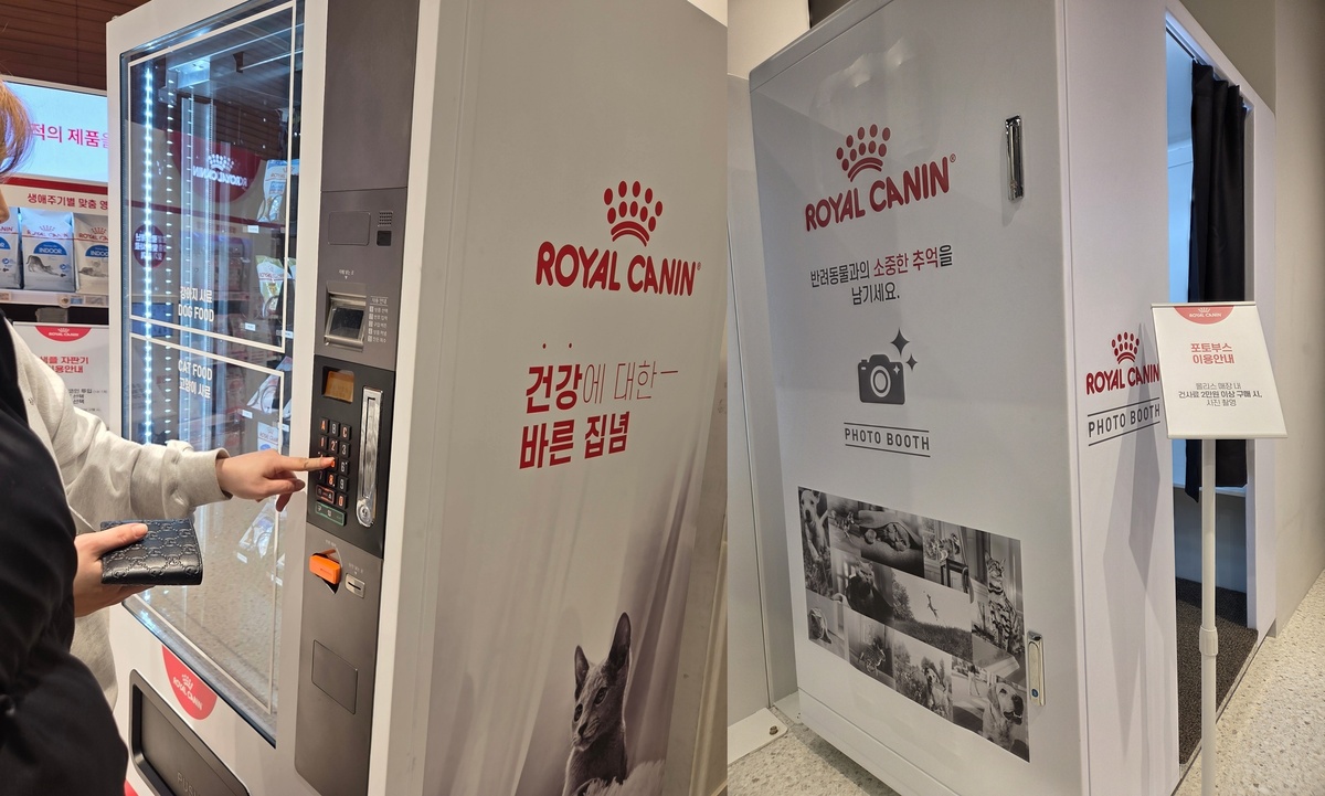 로얄캐닌 브랜드숍에 마련된 샘플자판기를 이용하는 고객(왼쪽)과 포토부스. 박재림 기자 이날 몰리스 직원은 “로얄캐닌이 워낙 대중적인 브랜드다 보니 방문객들의 관심이 크다”며 “브랜드숍이 생기기 전까지는 고양이용 제품과 강아지용 제품이 따로 있었는데 한 데 모여서 편하게 쇼핑할 수 있어 좋다는 반응”이라고 전했다.