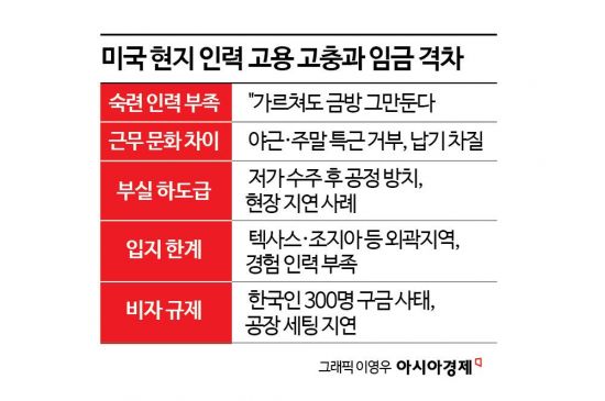 미국 조지아주 LG에너지솔루션 공장 프로젝트에 참여한 협력사 대표는 10일 본지에 "비자를 갖춘 인력을 구해도 보조 업무자 수준이 대부분"이라며 "전문가는 찾기 힘들고, 단순 보조 인력만 구인 시장에 나온다"고 말했다. 그는 한국 인력의 경우 시급 35달러 수준이지만, 현지 인력은 시간당 45~60달러를 요구한다고 했다. 단순 보조 인력도 현지 채용은 시급 35달러 수준이다. 그는 "현지 인력은 능력은 부족한데 비용만 비싸고, 근무 태도와 기강 문제까지 있어 안정적 채용이 힘들다"고 했다.
