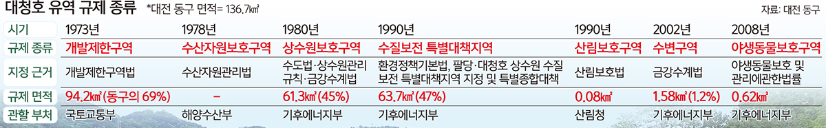 대청호는 금강 최초의 다목적 댐인 대청댐 건설로 만들어진 인공호수로 대전 동구와 대덕구, 충북 청주시와 보은·옥천군 등에 걸쳐 있다. 1973년 6월 개발제한구역으로 지정된 후 1980년 11월 상수원보호구역으로 묶였다. 대청호 주변 6만1260㎡ 면적이 상수원보호구역으로 지정됐는데 이는 동구 전체의 45%를 차지하는 면적이다. 동구 마을인 대청동은 면적의 97%가 상수원보호구역이다. 대전 전체로 보면 14.4%에 해당한다.