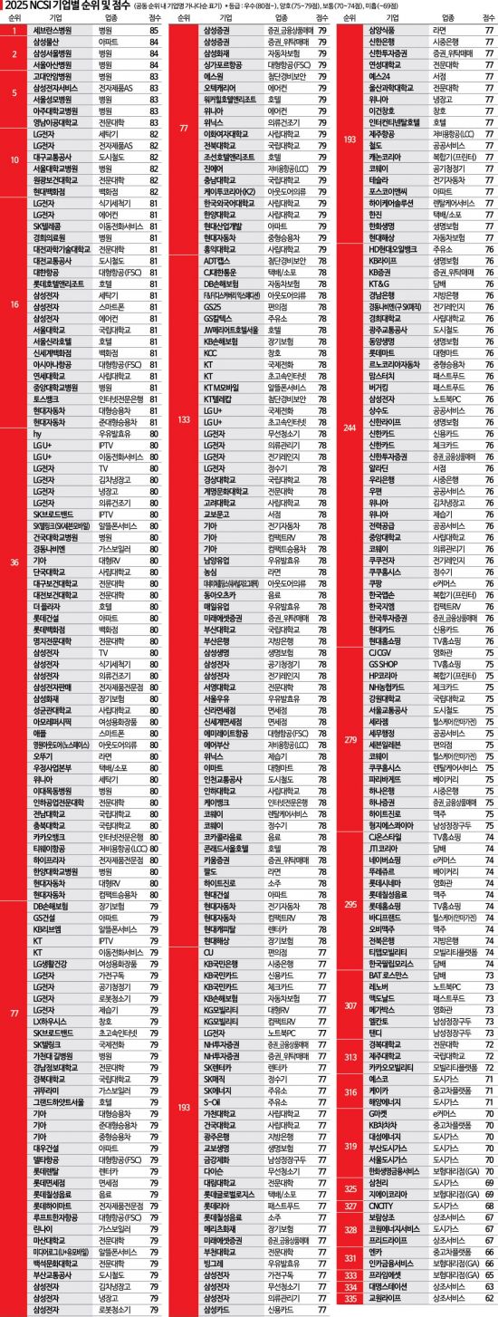 조사 결과 전체 335개 조사 대상 기업 중 병원 업종의 세브란스병원이 85점으로 가장 높은 점수를 받았다. 고객만족도 82점 이상의 '톱(TOP) 15'에는 세브란스병원을 포함해 병원 7개가 이름을 올렸다. 병원 업종의 조사 대상 13개 중 절반 이상이 톱 15에 올라 우리나라 병원 서비스 수준의 우수성을 가늠할 수 있게 했다는 설명이다. 또 아파트의 삼성물산, 전자제품A/S의 삼성전자서비스와 LG전자, 전문대학의 영남이공대학교와 원광보건대학교, 도시철도의 대구교통공사, 백화점의 현대백화점이 톱 15에 포함됐다.