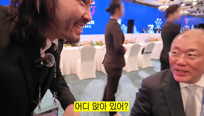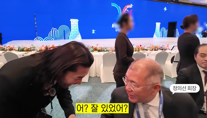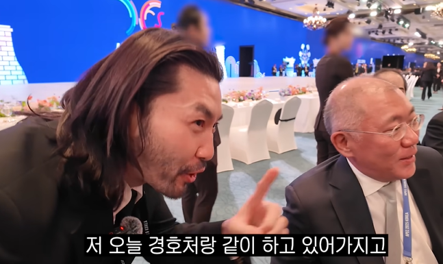 노홍철 유튜브 채널 '노홍철' 캡처. 그러자 정의선 회장은 "어? 잘 있었어? 어디 앉아 있어?"라며 친근한 말투로 답했고, "오늘 경호처랑 같이 하고 있어가지고 왔다갔다 하고 있습니다"라는 노홍철의 답변에 "잘해"라고 응원을 건넸다. 이어 노홍철이 "파이팅입니다 형님"이라고 하자, 정 회장도 미소지으며 "파이팅 파이팅"이라고 재차 응원을 건넸다.