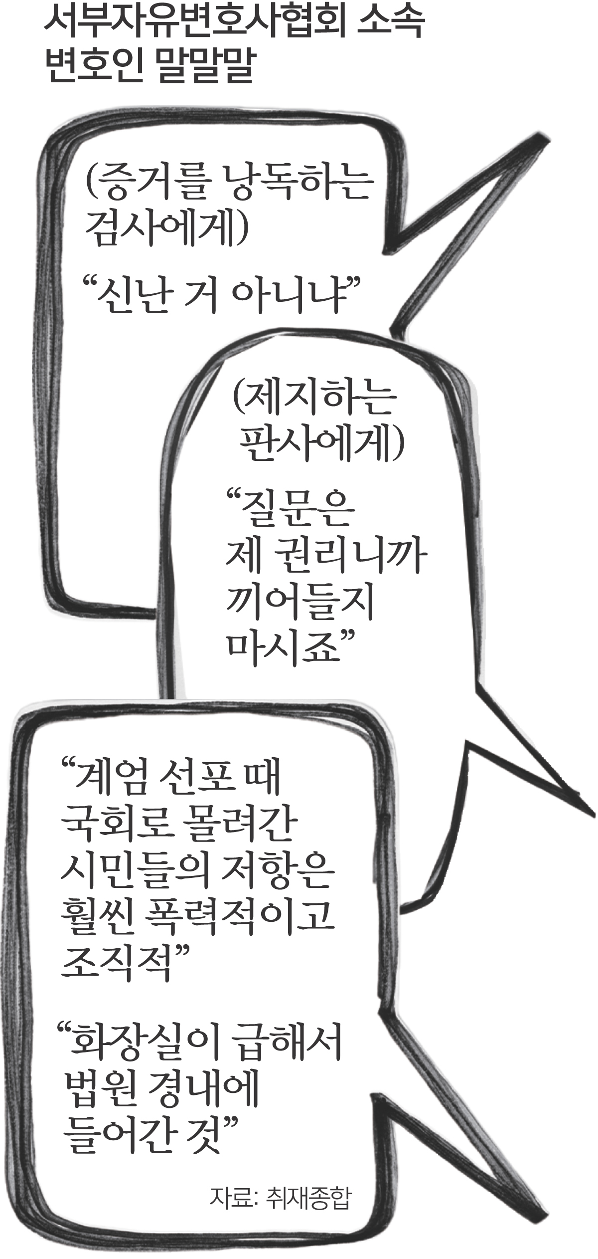 최근 윤석열 전 대통령 내란 재판을 8시간 ‘침대변론’으로 지연시켜 비판받은 A 변호사는 이미 1년 전부터 통상의 ‘법정 문법’에 어긋나는 언사를 일삼아 왔다. 김용현 전 국방부 장관 변호인단의 일원이자 서부자유변호사협회(협회) 지휘부인 그는 지난해 서부지법 난동 사태 재판에서 협회의 다른 변호인들을 이끌고 10개월간 판사와 충돌했다. 협회 소속 다른 변호인은 “화장실이 급해서 법원 담을 넘었다”는 변론까지 펼쳤다.