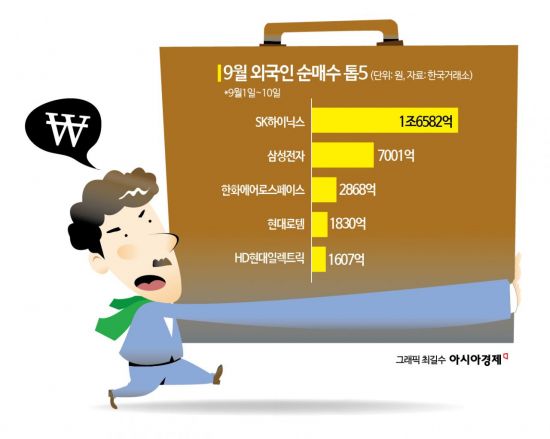 무엇보다 외국인의 복귀가 반가운 이유는 주가지수를 견인하는 시가총액 상위 종목으로 매수세가 살아나고 있다는 점이다. 이달 들어 코스피 '쌍두마차'인 SK하이닉스와 삼성전자가 외국인 순매수 1, 2위를 나란히 달리고 있는 점이 대표적인 예시다. 지난 7월만 하더라도 외국인이 삼성전자는 3조6000억원 넘게 사들이면서 SK하이닉스는 1930억원 팔아치우는 등 선별적으로 대응했던 것과 상반된 흐름이다.