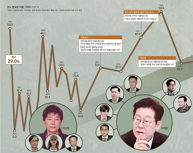 정치 격변기를 지날 때마다 ‘분노’ 감정이 차지하는 비율은 증가했다. 탄핵과 조기 대선을 거쳐 정권 교체를 경험한 지난해 민주당의 분노 비율이 크게 올랐고, 다른 정서의 출현이 줄어 응집력이 높았다.