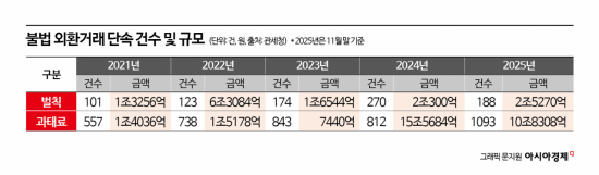 이날 킥오프 회의를 시작으로 매달 국장 주재로 열리는 회의에서 협업과제를 선정해 기획단속 등에 나서게 된다. 국경간 거래대금을 외국환은행을 통하지 않고 지급·수령하는 소위 환치기와 수출입 가격 조작, 허위신고 등을 통한 해외자산 도피, 외환거래 절차를 악용한 역외탈세와 자금세탁 등이 집중 조사 대상에 오른다. 정부는 과거 2022년 레고랜드 사태로 인한 환율 급등기에도 범정부 대응반을 한시적으로 운영한 바 있다. 재경부 관계자는 "무역거래로 위장하거나 환치기 등으로 해외로 빠져나가는 자금이 최근 몇 년 새 빠르게 늘어나고 있다"고 짚었다. 관세청에 따르면 불법 외환거래 단속 건수는 지난해(11월 말 기준) 1281건으로 전년(1082건) 대비 18% 이상 급증했다.