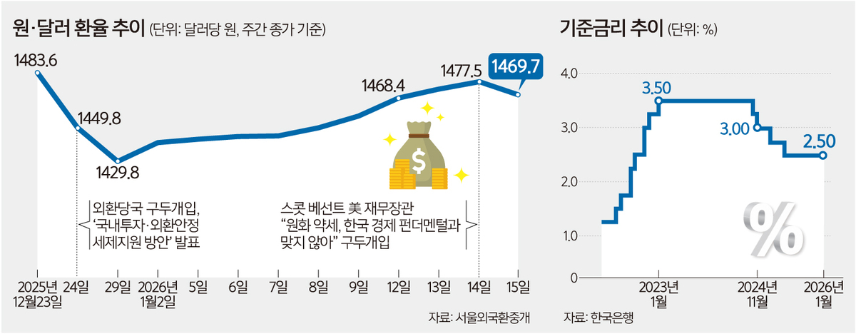 이창용 한국은행 총재가 15일 서울 중구 한국은행에서 열린 금융통화위원회 통화정책방향 회의에서 의사봉을 두드리고 있다. 연합뉴스 한은 금통위는 이날 올해 첫 통화정책방향(통방) 회의를 열어 기존 연 2.50%의 기준금리를 유지하기로 결정했다. 지난해 7월 이후 5연속 동결이다. 이창용 한은 총재는 이날 통방 후 기자간담회에서 동결 배경에 대해 “환율이 중요한 결정 이유였다는 것은 부정할 수 없는 사실”이라면서 자신을 제외한 금통위원 6명 전원이 동결 의견을 냈다고 밝혔다. 이번 금리 동결은 예견된 일이었다. 지난 연말 외환당국의 구두개입과 국민연금 환 헤지 등 전방위 대책의 영향으로 1480원대에서 1420원대까지 떨어진 환율은 최근 다시 치솟아 1470원 선까지 왔다.