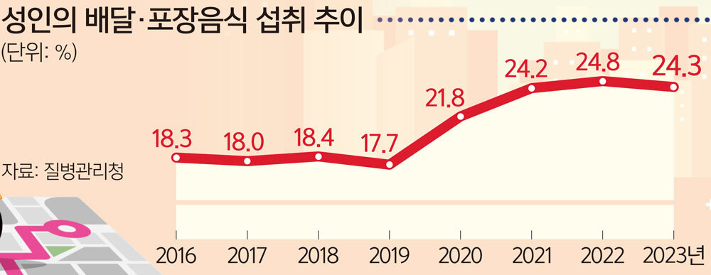 18일 질병관리청이 2016∼2023년 국민건강영양조사 자료를 토대로 분석한 ‘우리나라 성인의 식생활 현황’ 현안보고서에 따르면 하루 1회 이상 끼니를 배달·포장 음식으로 섭취하는 비율은 2023년 24.3%로 나타났다. 2016년 18.3%에서 6%포인트 급증했다. 2019년 17.7%에 머물렀던 배달·포장 음식 섭취 비율은 2020년 21.8%, 2021년 24.2%, 2022년 24.8% 등 코로나19 발생 이후 높은 수준을 유지해 왔다. 반면 음식점에서 식사한 비율은 2016년 42.9%에서 2023년 33.6%로 감소했다. 음식점에서 식사한 비율은 코로나19 유행으로 2020년 36.6%, 2021년 30.1%까지 급락했다.