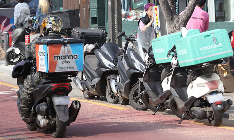 서울 마포구의 한 식당가에 세워진 배달 오토바이. 연합뉴스 배달·포장 음식을 먹을 경우 그렇지 않은 성인에 비해 지방, 나트륨 등을 과잉 섭취하는 것으로 나타나 주의가 필요하다는 지적이다. 보고서에 따르면 배달·포장 음식을 섭취한 사람은 에너지 섭취량 중 지방의 비율이 높고 식이섬유 섭취량은 적은 것으로 조사됐다.