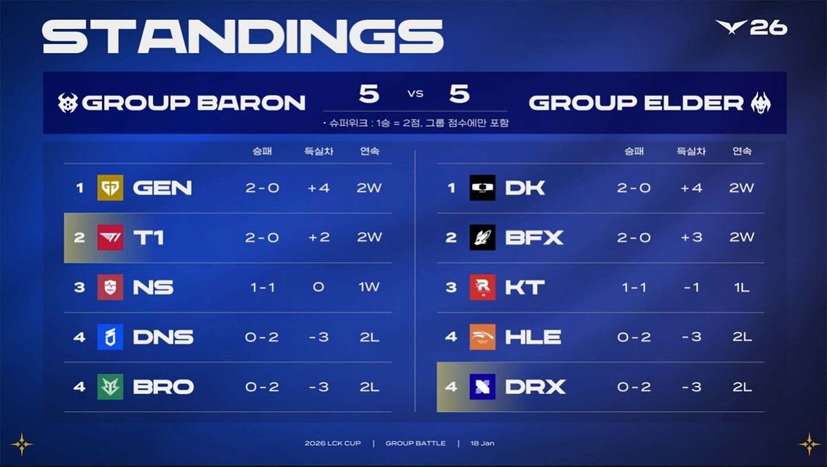 2연패로 아쉬운 출발을 보인 한화생명e스포츠. 라이엇 게임즈 제공 ◆바론vs장로 그룹, 5대5 접전 그룹 대항전으로 진행되는 LCK컵 1주 차는 바론 그룹과 장로 그룹 모두 상위권이 빠르게 형성되며 초반 판도가 드러났다. 그룹 간 성적은 5승 5패로 균형을 이뤘다.