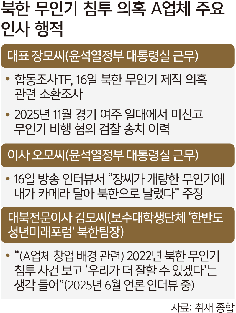 실제 임원으로 등기된 인물은 대표로 알려진 장씨뿐이었다. 그 밖에 장씨의 대학 후배이자 이사로 알려진 오모씨와 대북전문이사로 알려진 김모씨는 등기돼 있지 않았다. 김씨는 지난해 6월 한 언론 인터뷰에서 업체를 만든 배경에 대해 “(2022년) 북한 무인기 침투 사건을 보고 ‘우리가 더 잘할 수 있겠다’는 생각이 들었던 것 같다”고 했다. 군경합동조사 태스크포스(TF)는 16일 장씨를 불러 조사했다. 같은 날 30대 대학원생이라고 밝힌 오씨는 언론 인터뷰를 통해 자신이 무인기를 날렸다고 자수했다.