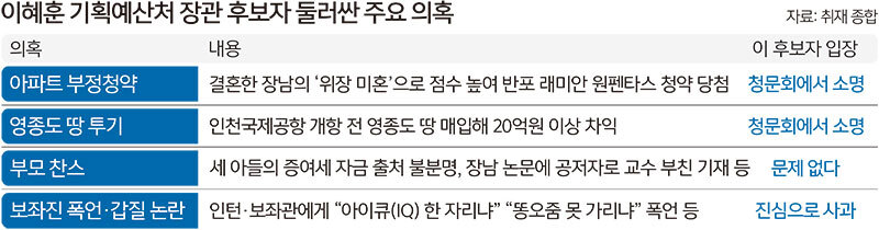 19일 정치권에 따르면 야권이 가장 문제 삼고 있는 이 후보자의 의혹은 ‘위장 미혼’ 논란이 불거진 아파트 부정청약 의혹이다.