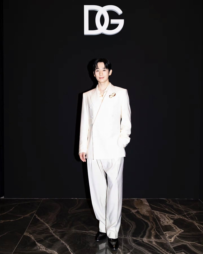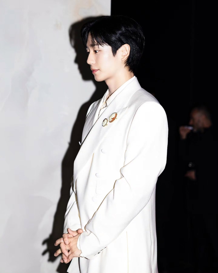 돌체앤가바나 SS26 사토리아 컬렉션의 화이트 셋업 수트를 입고 등장한 그는, 마치 캔버스 위에 그려진 완벽한 초상화 같은 비주얼로 현장을 압도했다. 특히 텍스처가 살아있는 더블 브레스티드 재킷에 우아한 실크 셔츠를 매치하고, 가슴 위를 장식한 카메오 브로치로 고전적인 미학을 더해 ‘현대판 왕자님’의 정석을 보여줬다.