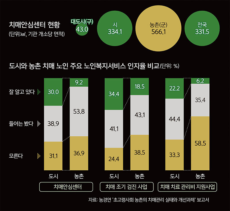 상황이 이렇지만 농촌 치매관리 여건은 오히려 열악했다. 정부의 치매 대응체계를 보면 전국 256곳에 설치된 치매안심센터가 일차적으로 사례관리, 조기검진, 맞춤형 상담을 담당하며 핵심 ‘전초기지’ 역할을 한다. 그런데 치매안심센터 1개소당 관할해야 할 지역면적은 농촌이 556.1㎢로 나타나 대도시(43.0㎢)나 도시(334.1㎢) 대비 넓었다. 기초 인프라에 대한 접근성부터 현저히 떨어지는 셈이다.