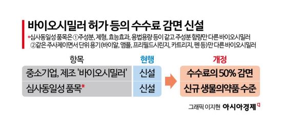 규정 개정안에 따르면 동등생물의약품의 품목허가 수수료가 현재 803만1000원에서 3억1000만원으로 재산정된다. 식약처는 관련 업계의 부담 완화를 위해 중소기업이 국내에서 개발한 동등생물의약품을 허가 신청한 경우 수수료의 50%를 감면하며, 동일 신청인이 유사한 허가를 신청한 경우에는 두 번째 품목부터 수수료를 800만원(전자민원 기준)으로 감면한다.