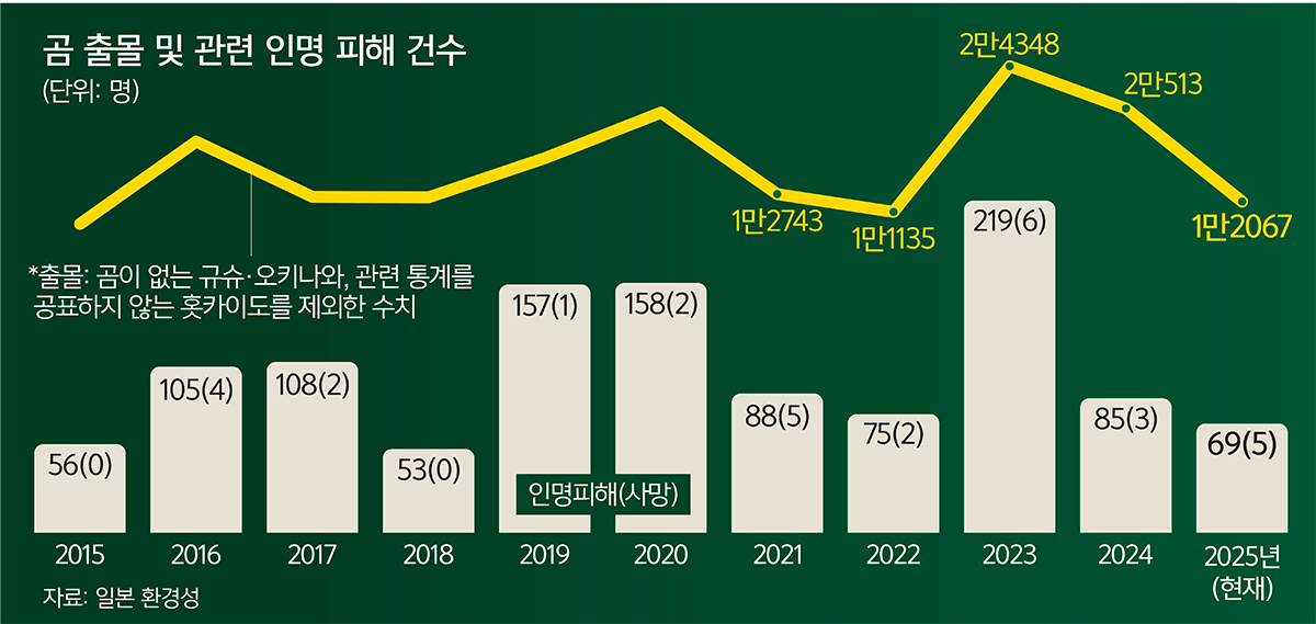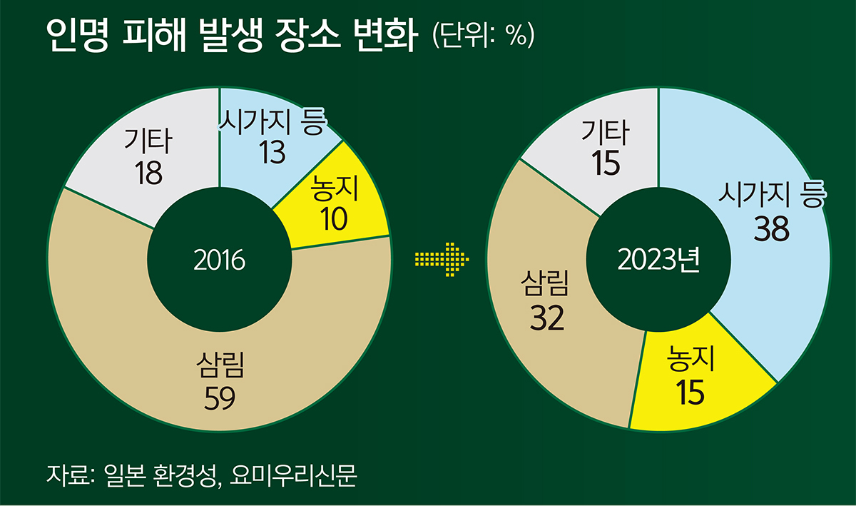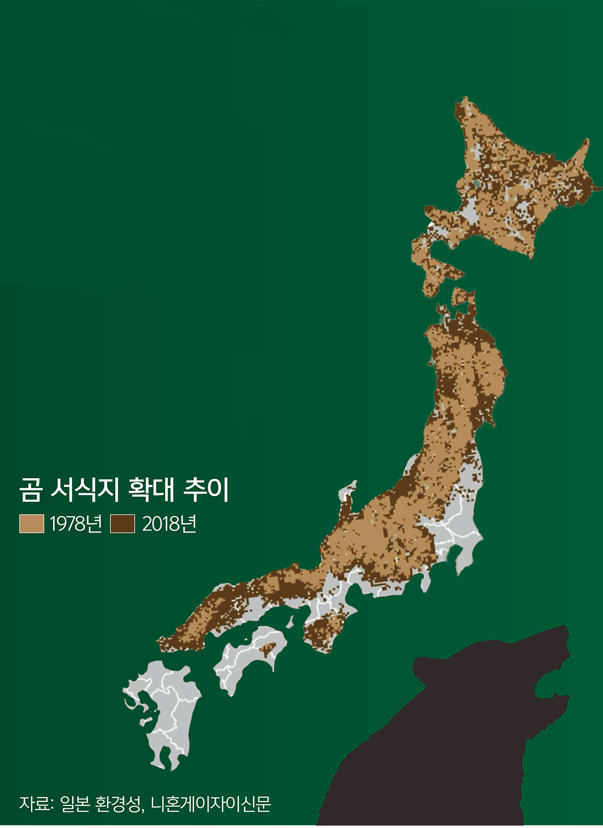 ◆지방소멸에… 서식지 늘리는 일본 곰 환경성의 2016∼2018년 조사에서는 곰에 의한 인명 피해 발생 장소의 절반 이상이 삼림이었다. 2023년엔 반대로 시가지나 민가 주변, 농지가 50%를 넘었다. 지난해에도 40% 초반대였다. 곰 서식 지역은 1978∼2018년 사이 2배로 증가했다. 일본 국토의 60% 이상을 차지한다. 곰이 인간 생활권에 근접해 오고 있음을 보여주는 통계들이다. 니혼게이자이신문은 “이대로 방치한다면 2050년에는 도시도 점거당해 일본 열도는 ‘곰의 행성’이 될 것”이라고 했다.