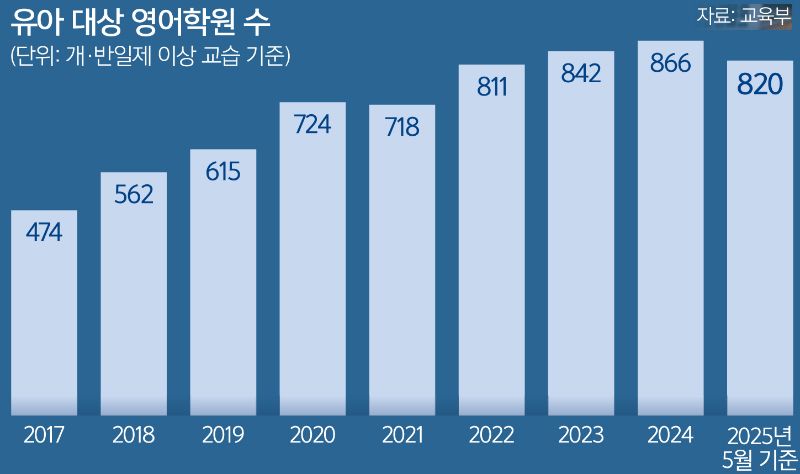 조국혁신당 강경숙 의원(왼쪽 두번째)과 시민단체 ‘사교육걱정없는세상’이 7월23일 국회에서 기자회견을 열고 유아 영어학원 교습 등을 제한하는 내용의 학원법 개정안의 필요성을 설명하고 있다. 사교육걱정없는세상 제공 ◆유치원 대체기관된 영어학원 14일 교육부에 따르면 하루 4시간 이상 교습하는 유아 영어학원은 올해 5월 기준 820곳으로, 2017년(474곳)의 2배 가까이 늘었다. 지난해(866곳)보다 줄어든 수치지만, 산업 규모 자체가 줄었다고 보기는 어렵다. 서울의 한 영어학원 관계자는 “최근 몇 년 새 소규모 학원은 줄고, 대형 프랜차이즈 학원 중심으로 통폐합됐다”며 “재원생은 계속 늘어나는 분위기”라고 전했다.
