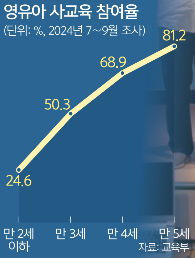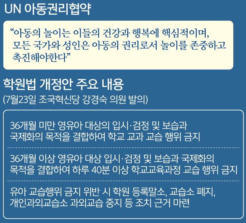 유아 영어학원은 아동의 전인적 성장보다 ‘영어학습’에 초점이 맞춰진 학원임에도 공교육 기관처럼 아이들을 빨아들이며 사교육비 상승을 이끌고 있다. 교육부가 지난해 유아 사교육비를 시험 조사한 결과 반일제 이상 유아 영어학원에 자녀를 보내는 집은 1인당 월평균 154만5000원을 쓴 것으로 나타났다. 경기의 한 국공립유치원 관계자는 “초등학교로 치면 학습에 효율적이라며 학교에 가지 않고 수학·영어학원만 다니는 아이들이 늘어나는 것과 마찬가지인 상황”이라고 우려했다. 유명 영어학원 입소 시험을 위한 사교육이 성행하며 4·7세고시란 말까지 나오자 조국혁신당 강경숙 의원은 올해 7월 유아 사교육을 제한하는 ‘학원의 설립·운영 및 과외교습에 관한 법률’(학원법) 개정안을 발의했다. 36개월 미만 영유아는 영어·수학 등 학교 교과 교습 행위를 금지하고, 36개월 이상 미취학 아동은 하루 40분으로 교습 시간을 제한하는 것이 핵심이다.