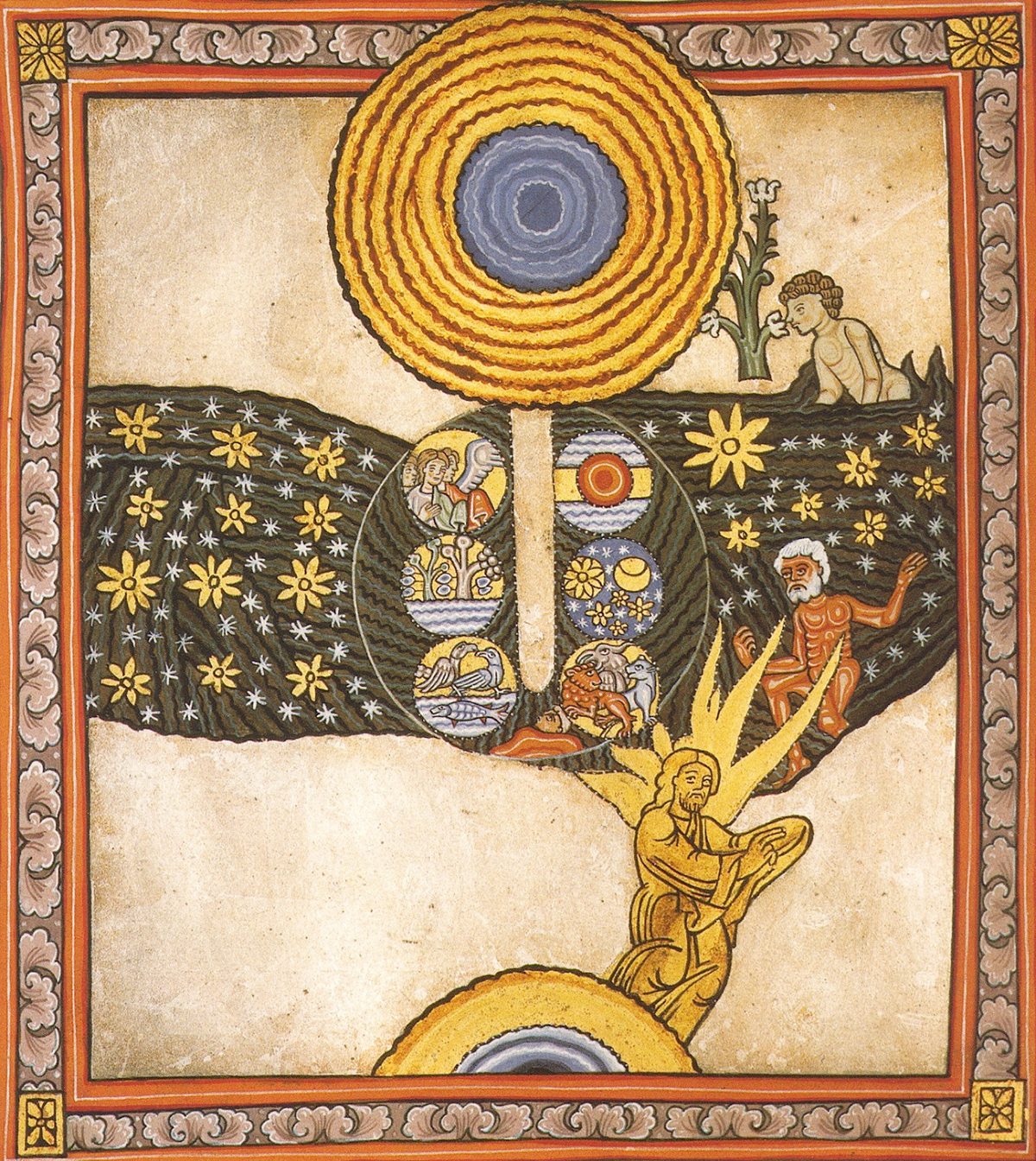 힐데가르트 폰 빙엔, ‘스키비아스’ 중 ‘구원자’, 1151∼1152년. 퍼블릭 도메인 이미지 ◆구원의 빛, 새로운 신학 ‘스키비아스’의 2부는 아담과 그리스도를 중심으로 한 ‘구원자’의 이미지로 시작된다. 힐데가르트는 창세기의 전통적 서사를 변형하여, 사탄이 아담에게 선악을 알게 하는 유혹을 준 것이 아닌, 아담이 ‘순종의 달콤한 계율’을 상징하는 꽃을 선택하지 못해 실패한 것으로 묘사한다.