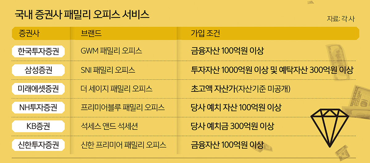 우리나라에서는 2011년 미래에셋증권이 패밀리 오피스 브랜드를 공식화하면서 국내 패밀리 오피스 시장의 포문을 열었다. 2020년을 기점으로 증권사의 시장 참여가 급격히 확대됐으며, 삼성증권의 패밀리 오피스 서비스 출범 이후 대형사를 중심으로 다양한 서비스들이 속속 등장했다. 국내 증권사들의 패밀리 오피스 고객 자산 기준은 10억원에서 1000억원까지 다양하다. 이 가운데 예탁자산 100억원 이상이 가장 많다. 삼성증권은 국내 증권사 중 가장 높은 고객 기준을 적용하며, 투자 가능 자산 1000억원 이상 및 예탁자산 300억원 이상이 기준이다. 그 다음으로 KB증권이 금융자산 300억원 이상을 대상으로 한다. NH투자증권과 한국투자증권은 예탁자산 100억원 이상인 고객에게 패밀리 오피스 서비스를 제공하며, 신한투자증권도 금융자산 100억원 이상의 초고액 자산가를 주요 고객으로 삼고 있다. 미래에셋·하나·신영증권은 명확한 자산 기준을 공개하지 않지만, 일반적으로 10억~100억원 수준인 것으로 알려졌다.