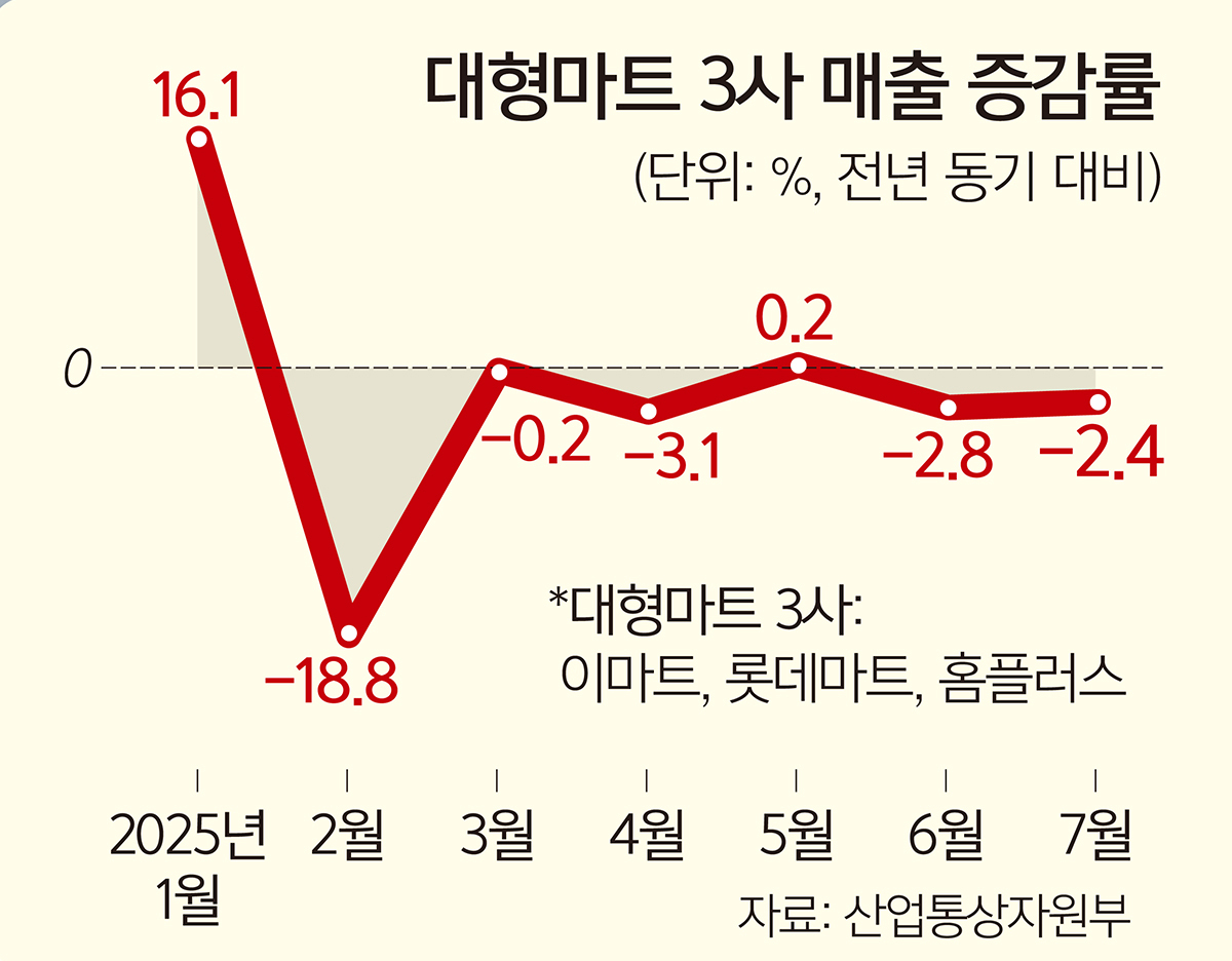 31일 산업통상자원부에 따르면 대형마트(이마트·롯데마트·홈플러스)는 올해 1월과 5월을 제외하고 다섯 차례 역성장을 기록했다. 지난달에도 전년 동월보다 2.4% 매출이 감소해 부진을 면치 못했다. 지난달부터 지급된 민생회복 소비쿠폰 사용처에서 SSM과 대형마트가 모두 제외됐지만, SSM이 최근 5개월간 매출 성장세를 이어온 것과 대조적이다.