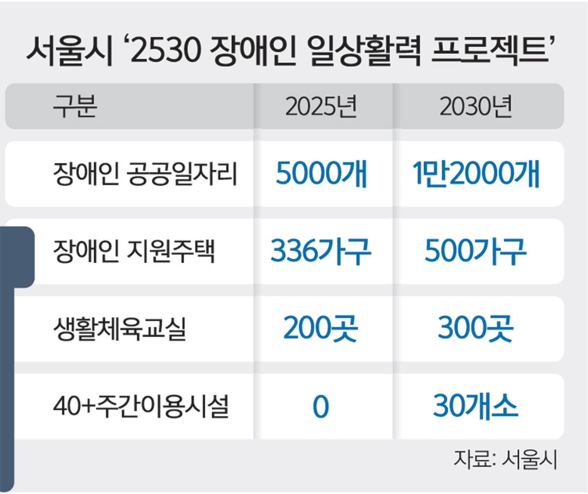 서울시가 장애인 공공일자리를 2030년 1만2000개까지 확대하는 등 일자리, 주거, 이동권, 인권 4대 분야를 아우르는 장애인 종합 지원책을 내놨다. 오세훈 서울시장은 16일 이 같은 내용의 장애인 지원 5개년 종합계획 ‘2530 장애인 일상활력 프로젝트’를 발표했다.