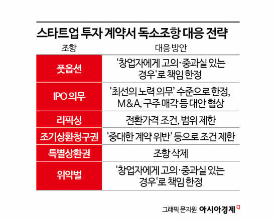 투자자가 회수(엑시트) 안전장치로 계약서에 넣는 기업공개(IPO) 의무조항도 놓쳐서는 안 된다. IPO 불발 이후 손해배상 소송이 스타트업은 물론 창업자에게 큰 부담이 될 수 있다. 문성 법무법인 율촌 변호사는 "계약 단계에서 IPO 추진 의무를 '최선의 노력 의무' 수준으로 한정해야 한다"며 "최근 IPO 자체가 쉽지 않은 점을 고려해 시장 상황 등 외부 변수에 따른 불가항력적인 사유를 명확히 규정하거나 IPO 대신 M&A, 구주 매각 등 대체 방안을 인정하도록 협상할 필요가 있다"고 강조했다.