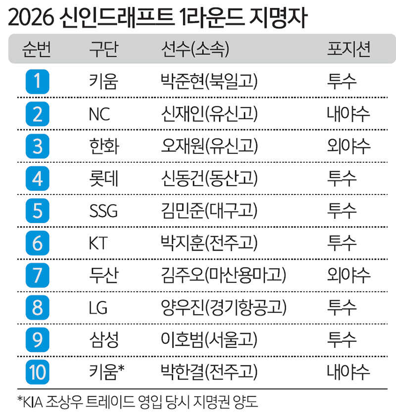 부전자전 북일고 박준현(오른쪽)이 17일 서울 송파구 롯데호텔에서 열린 2026 KBO 신인드래프트에서 전체 1순위로 키움에 지명된 뒤 아버지 박석민 전 두산 코치와 함께 기념 촬영을 하고 있다. 뉴스1 올해 드래프트는 2024년도 구단 순위의 역순인 키움-NC-한화-롯데-SSG-KT-두산-LG-삼성-KIA 순서로 지명권을 행사하지만 KIA가 조상우를 트레이드로 영입하면서 1라운드 10순위 지명권을 키움에 양도해 키움은 1라운드에서만 2명을 선발했다. 이런 지명권 양도를 통해 키움과 NC는 13명, 한화와 SSG는 10명, KIA는 9명을 지명했다.