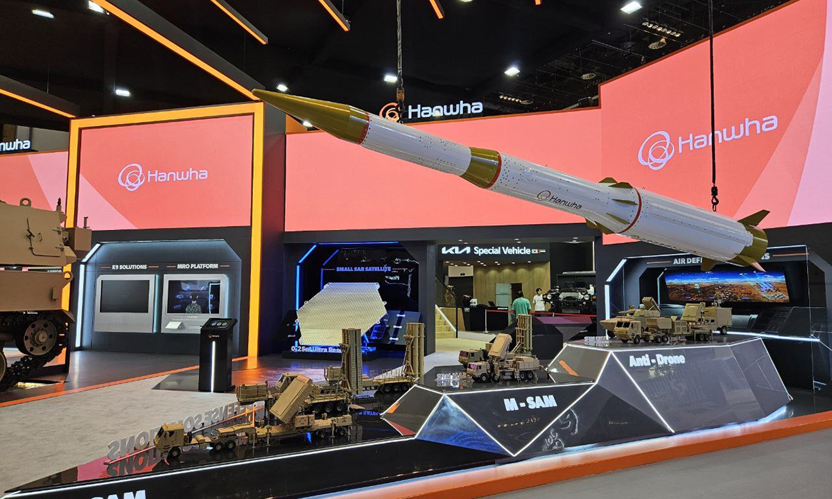 한 관람객이 LIG넥스원이 만든 지대공미사일들을 바라보고 있다. 세계일보 자료사진 M-SAM 블록Ⅲ는 블록Ⅱ(요격고도 15∼20㎞)보다 2배 높은 고도에서 적 항공기나 미사일을 요격한다. 탐지거리나 동시 교전 능력 등도 기존보다 대폭 향상됐다. 2030년까지 8688억원을 투자해 체계개발을 완료할 예정이다.