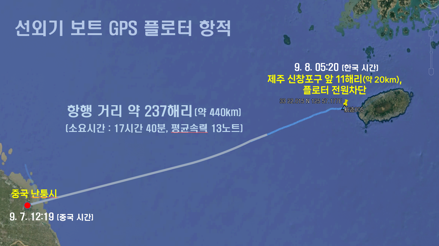 밀입국 보트에 설정한 위성항법장치(GPS) 플로터 항적. 제주해양경찰청 제공 또 목적지 제주도와 가장 거리가 짧은 중국 난퉁시를 출발지로 설정, 지난 7일 중국시간 낮 12시 19분쯤 출항했다. 이들은 17시간 40분을 항해해 이튿날 제주시 한경면 용수리 해녀탈의장 인근 해안에 도착하자마자 보트를 버리고 제주시와 서귀포시 지역으로 뿔뿔이 흩어졌다. 이들 중국인 일부는 제주에 있던 중국인 조력자의 도움을 받아 도주하다 밀입국한 다음 날인 8일부터 11일까지 나흘간 경찰에 검거되거나 경찰의 수사망이 좁혀오자 자수했다.