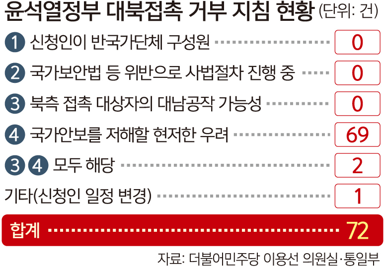 윤석열정부 시절 통일부의 대북 접촉신고 수리 거부율이 문재인정부의 180배에 달하는 것으로 나타났다. 거부의 근거가 된 정부 내부지침이 남북 간 교류, 협력을 촉진하는 법률의 취지에 어긋날 소지가 있는 것으로 파악됐다. 윤석열정부가 남북관계에 물꼬를 트기 위한 민간의 대북 접촉 시도를 자의적으로 차단해왔다는 비판이 나온다.