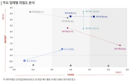 한신평은 국내 업체 중 세아제강과 세아베스틸 및 세아창원특수강이 사업 위험도가 높다고 분석했다. 그는 "세아제강은 대내외로 위험에 크게 노출된 강관사업에 편중됐다"면서도 "수년간 우수한 실적을 바탕으로 재무 안정성이 향상된 점이 단기 사업 위험을 보완하고 있다"고 말했다.