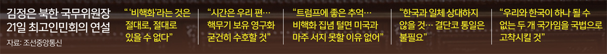 김정은 북한 국무위원장(가운데)이 21일 평양 만수대의사당에서 열린 최고인민회의 제14기 제13차 회의에 입장하며 참석자들의 박수를 받고 있다. 평양=노동신문· 뉴스1 ◆미국에 대화 손짓하지만 “비핵화는 없다” 22일 조선중앙통신에 따르면 김 위원장은 전날 최고인민회의 연설에서 도널드 트럼프 대통령과의 “좋은 추억”을 언급하면서 미국과의 대화 재개 가능성을 시사하면서도 강한 어조로 ‘비핵화 불가론’을 설파했다. 김 위원장은 특히 “핵을 포기시키고 무장해제시킨 다음 미국이 무슨 일을 하는가에 대해서는 세상이 이미 잘 알고 있다”면서 “제재 풀기에 집착하여 적수국들과 그 무엇을 맞바꾸는 것과 같은 협상 따위는 없을 것”이라고 밝혔다. 한·미의 기존 북핵 접근법인 비핵화 시 경제 보상책을 약속하는 방식은 더는 유효하지 않다는 뜻이다.