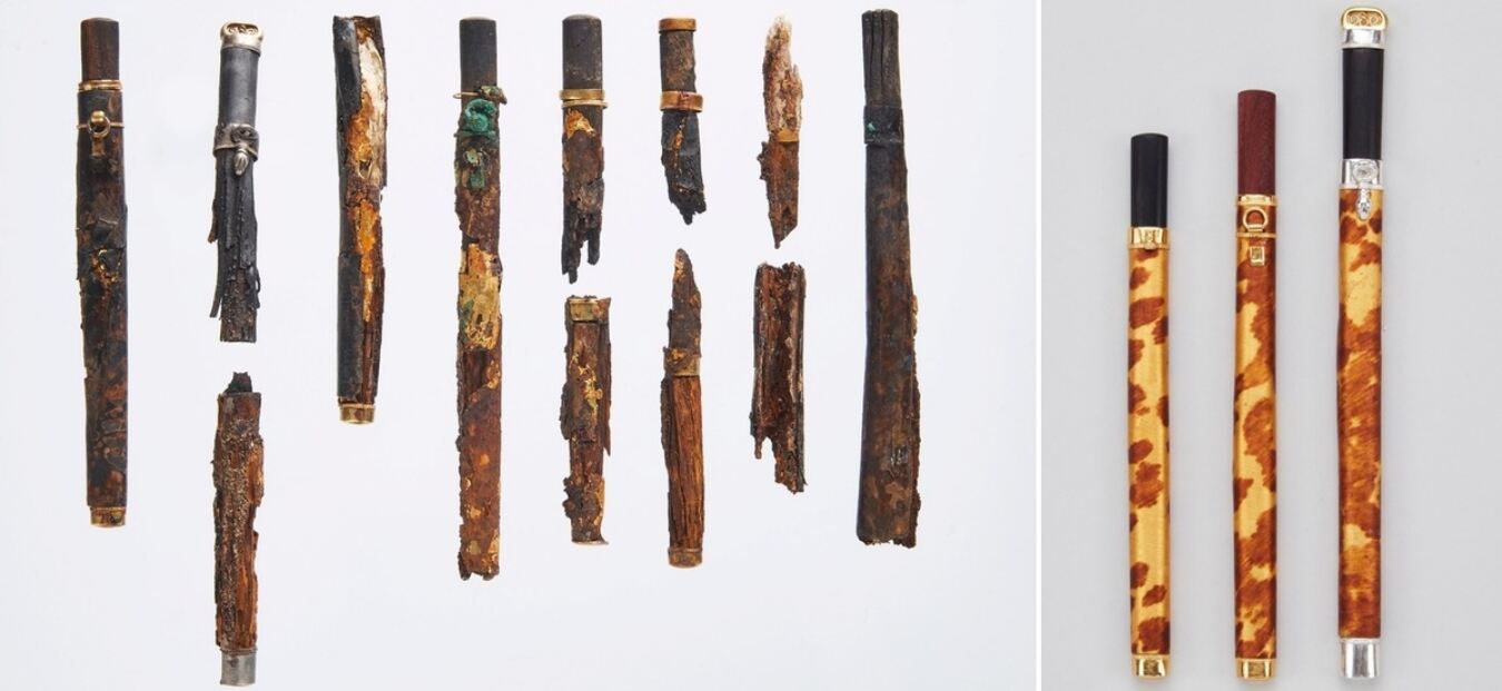 손칼은 1400여년이 지나면서 덮여 있던 직물과 함께 부식됐지만, 철제로 만들어진 칼과 목재·가죽으로 된 칼집의 손잡이와 칼집 양쪽 끝부분은 금제(金製)로 투겁을 씌워 마감된 모습을 확인할 수 있다. 특히 손칼 한 점은 손잡이인 환두(環頭)에 식물무늬를 투조(透彫)해 화려하게 장엄(莊嚴)했고, 자루와 칼집 양식은 타출 점열문 등으로 장식됐다. 환두에 금동사를 이용해 구름무늬(雲文)를 넣은 것도 있다.