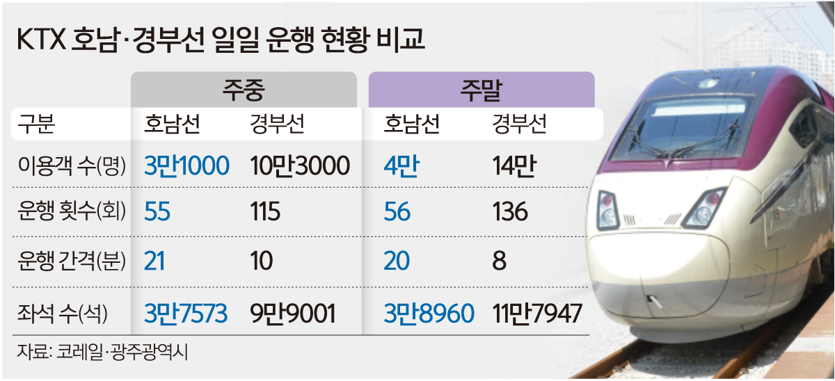 23일 광주시와 코레일 등에 따르면 하루 KTX 호남선 운행횟수는 주중 55회, 주말 56회로 KTX 경부선의 115회, 136회보다 2배 이상 적다. 이용객이 많은 주말 증편에는 더 큰 차이를 보이고 있다. 호남선은 주말에 1회 증편에 불과하지만 경부선은 21회로 20배나 차이가 난다.