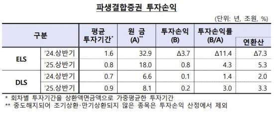 올해 상반기 ELS 투자손익률은 5.3%였다. 전년 동기 대비 12.6%P 증가했다. DLS도 1.3%P 증가한 3.3%였다. H지수 기초 ELS가 작년 중 대부분 상환됨에 따라 ELS 투자수익률이 손실에서 이익으로 전환했다.