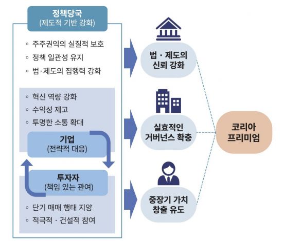 또한 제도적 차원에서는 법ㆍ제도의 집행력과 정책 일관성을 높이는 한편, 일반주주의 권익을 보호함으로써 한국 시장에 내재된 제도적 위험프리미엄을 완화해야 한다고 강조했다. 이 밖에 투자자들 역시 단기 매매 중심의 투자행태를 지양하고 기업의 지속가능 한 가치 창출을 유도하는 책임 있는 관여자로 변모할 필요가 있다고 김 연구위원은 덧붙였다.