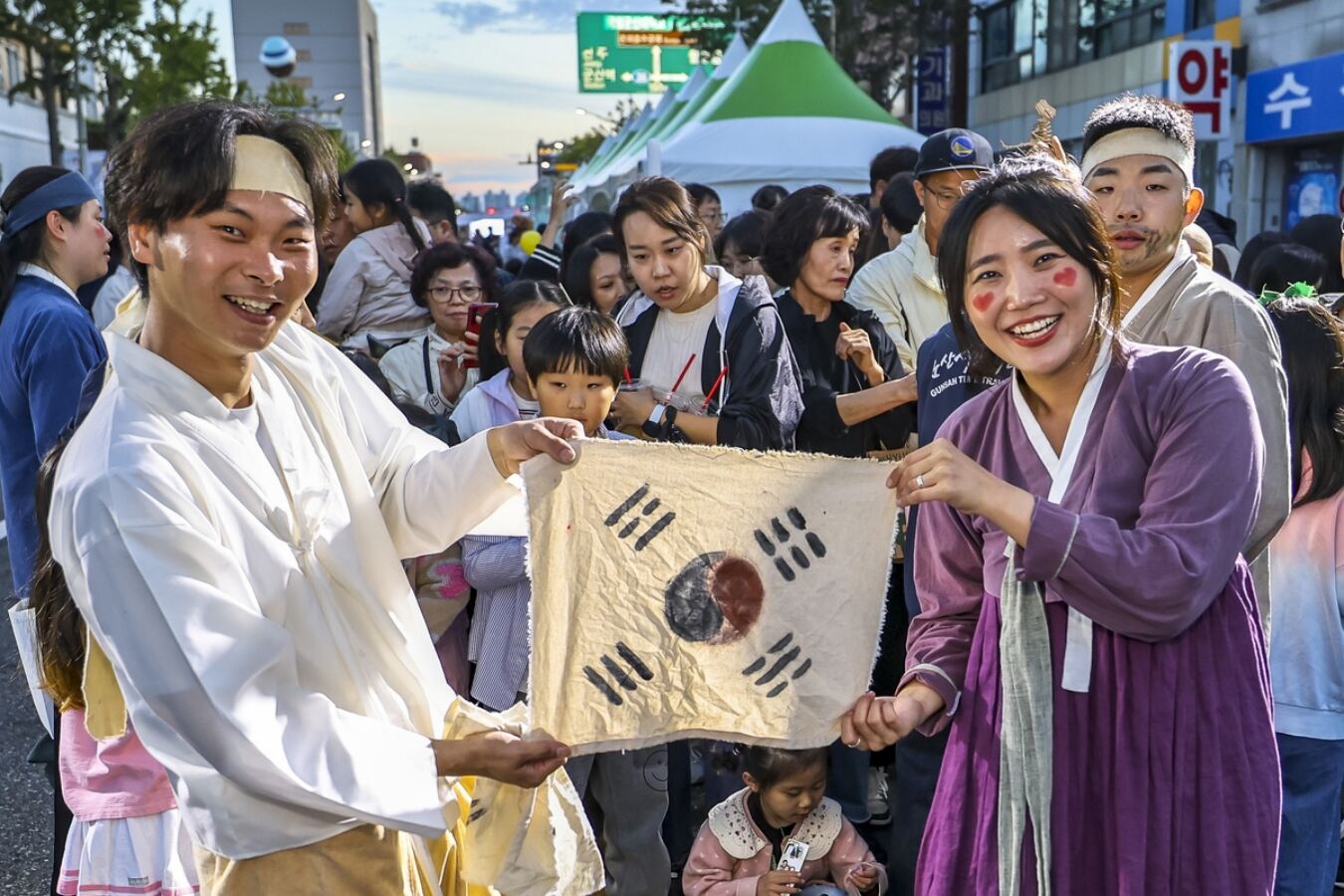 지난해 군산시간여행 축제에서 옛 복장을 하고 군산만세운동에 참여한 시민들이 손수 그린 태극기를 들어보이고 있다. 군산시 제공