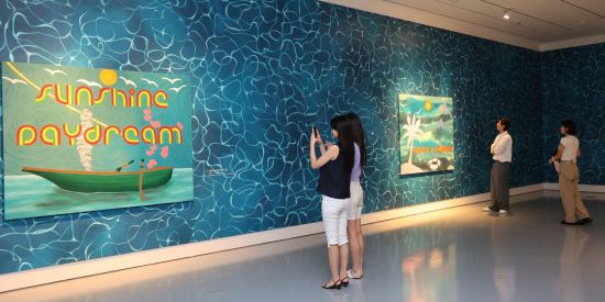 웅장한 아치 형태의 입구에 들어서자 3m 높이의 야자수 모형과 함께 바나나잎이 빼곡히 덮인 형태의 초록색 벽지가 양쪽 벽을 에워싸고 있었다. 이들 벽지 위에 태양과 히말라야, 사막, 무지개 등을 형상화한 강렬한 색채의 팝아트 작품들이 눈을 사로잡았다. '세상은 너의 것(The World is Yours)' '너는 훌륭한 것을 받을 자격이 있어(You deserve great Things)' '히트곡을 연주해(Play the hits)' 등 붉은색 글씨로 표현한 회화의 주제들은 밝고 긍정적인 메시지를 담고 있었다.