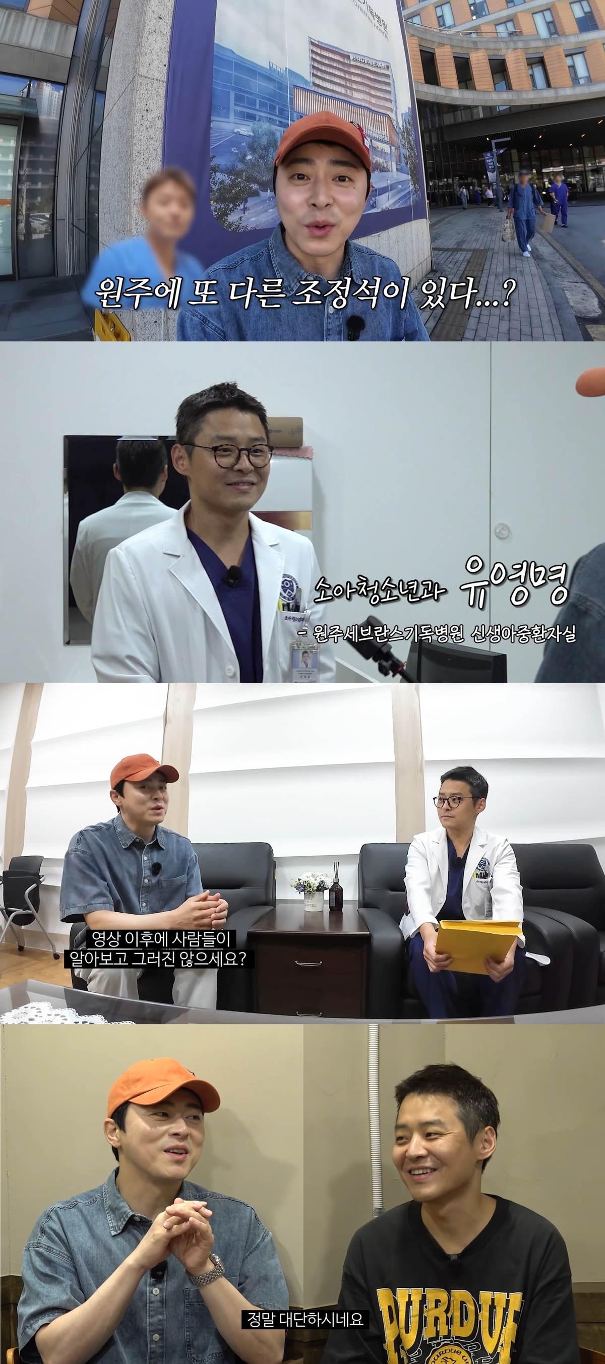 유 교수를 보기 위해 원주로 찾아간 조정석. 조정석 유튜브 캡처 이에 조정석이 “그런데도 출연을 허락해줘서 감사하다”고 연신 인사를 전하자, 유 교수는 “아무래도 유튜브에 나오다 보면 소아과 의사들이 뭘 하는지 관심을 가질 수도 있고, 신생아 중환자실이 뭐 하는 곳인지 알 수 있어서 (출연을 결심했다)”며 “홍보를 하면 소아과에 대한 인식이 좋아지지 않을까 싶어서 제가 오히려 더 감사하다”고 겸손한 모습과 함께 본업을 사랑하는 출연 이유를 밝혀 네티즌들에게 감동을 안겼다.