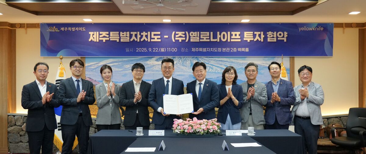 25일 제주도에 따르면 ㈜옐로나이프와 투자협약을 맺고 10월 내 제주 본사 이전과 도민 고용 확대, 향후 지역 내 사업 추진에 협력하기로 뜻을 모았다.