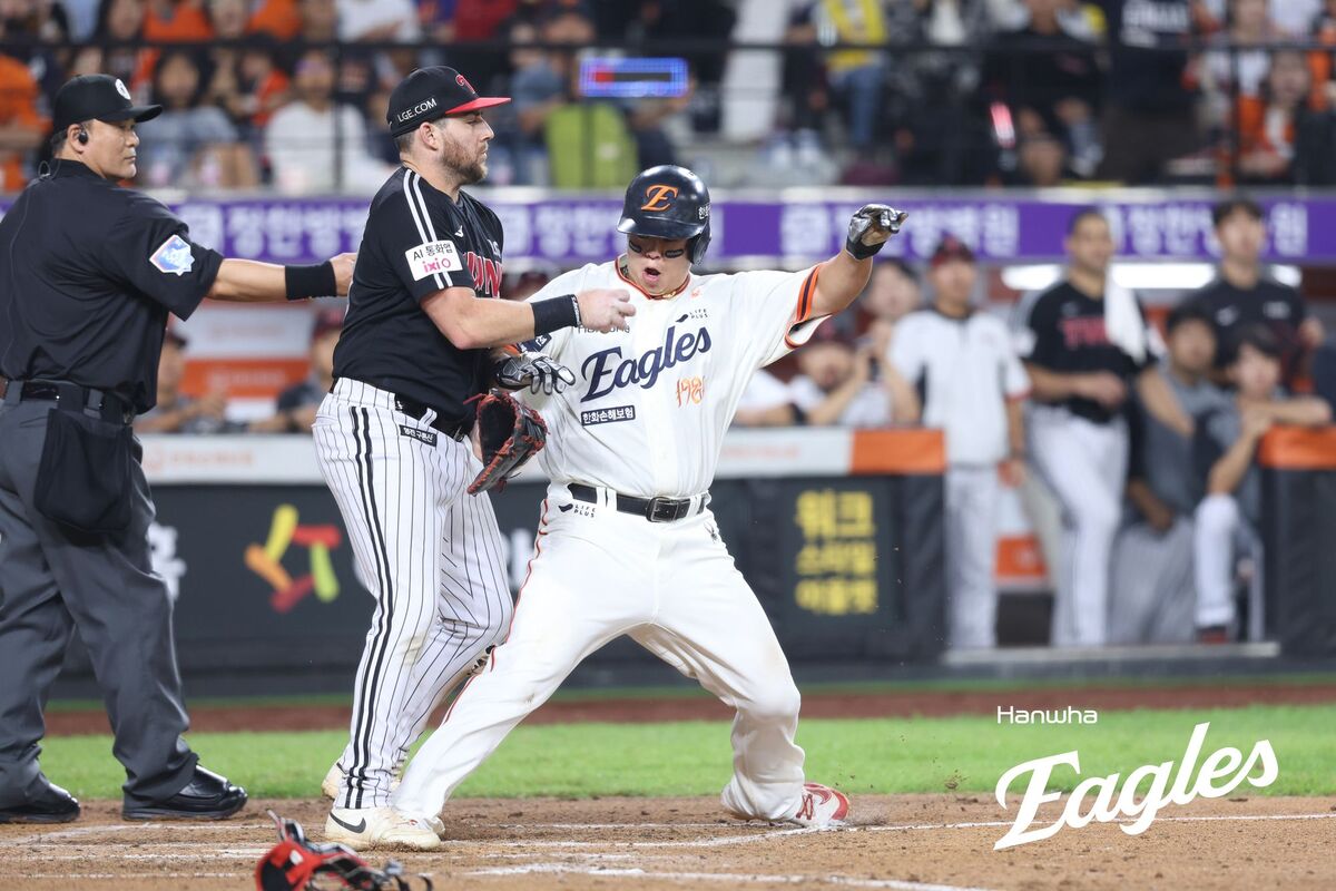 26일 오후 대전 한화생명 볼파크에서 열린 프로야구 '2025 신한 SOL뱅크 KBO 리그' LG 트윈스와 한화 이글스의 경기, LG 염경엽 감독이 6회말 1사 2,3루 한화 노시환의 런다운 상황에서 비디오 판독 끝에 아웃에서 세이프로 정정되자 심판에게 강하게 어필하고 있다. 뉴스1 LG 염경엽 감독의 선택은 순수신인으로 필승조 한 자리를 꿰찬 우완 김영우. 여기서 하주석이 이해할 수 없는 플레이를 펼쳤다. 스퀴즈 번트라고 하기엔 타구 속도가 너무 빠른 기습 번트를 댔고, 이 타구는 3루 주자 노시환이 홈까지 반도 달리기 전에 투수 김영우에게 잡혔다. 김영우는 노시환을 런다운 플레이로 몰았다. 공을 이어받은 박동원은 노시환을 글러브로 태그했다. 어이없이 아웃카운트 하나가 올라가는 듯 했다. 그러나 한화 벤치는 비디오 판독을 신청했고, 판독 결과 박동원이 공은 오른손에 쥐고 왼손에 낀 빈 포수 미트로 노시환을 태그한 것으로 나왔다. 야구에서 태그는 공을 쥐고 있는 손으로 하거나 공이 들어있는 글러브로 해야만 유효한 것으로 인정돼 아웃 처리된다. LG 염경엽 감독은 노시환이 박동원의 태그를 피하는 과정에서 쓰리 피트 라인을 벗어난 게 아니냐고 항의해봤지만, 소용없었다.