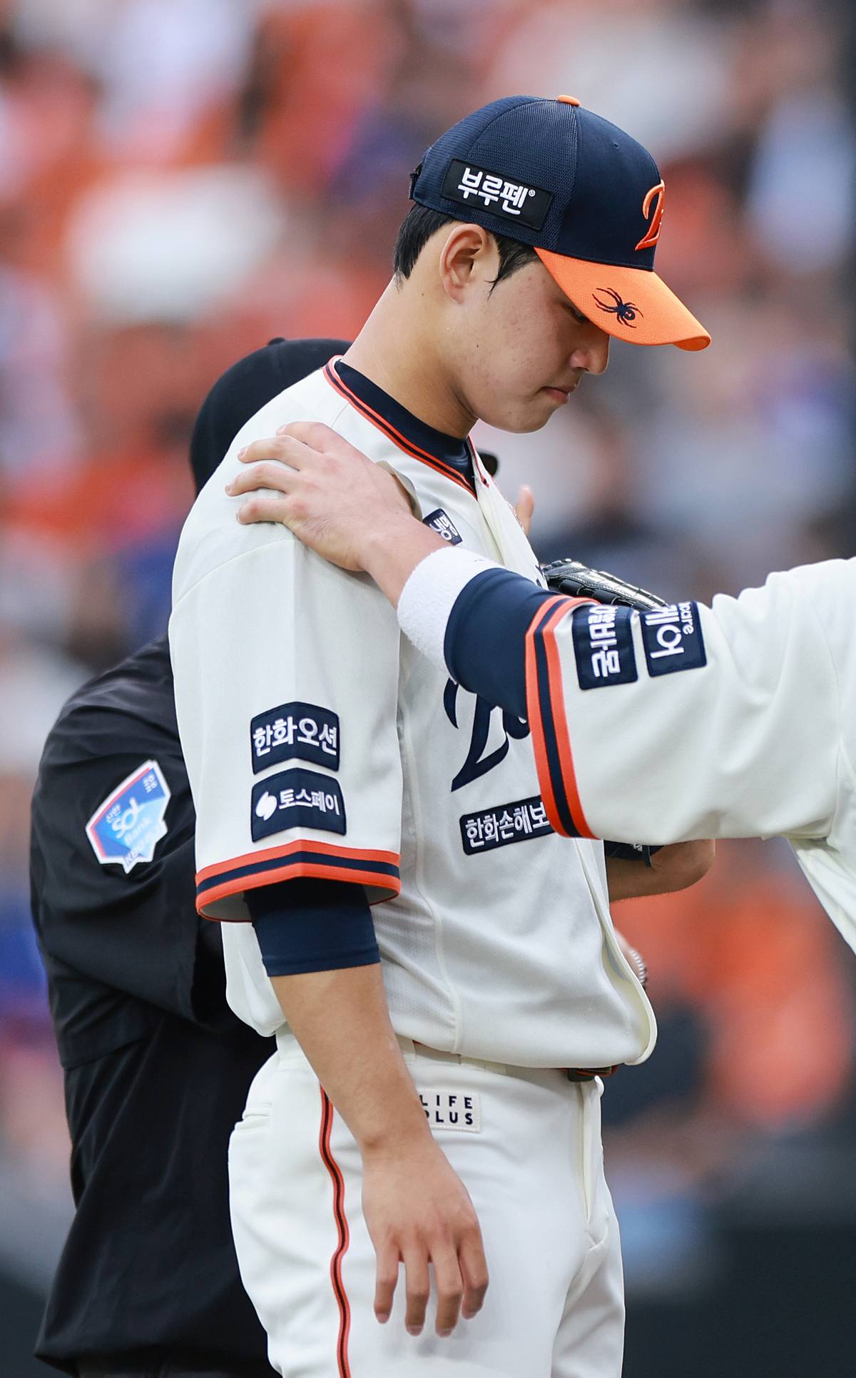 27일 대전 한화생명볼파크에서 열린 프로야구 2025 신한 SOL 뱅크 KBO리그 LG 트윈스와 한화 이글스의 경기. 1회초 2사 1루 LG 홍창기 타석을 앞두고 한화 선발투수 문동주가 마운드를 방문한 포수 최재훈 이야기를 듣고 있다. 연합뉴스