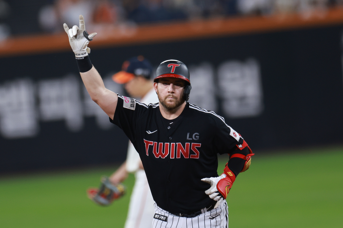 27일 대전 한화생명볼파크에서 열린 프로야구 2025 신한 SOL 뱅크 KBO리그 LG 트윈스와 한화 이글스의 경기. 6회초 2사 LG 오스틴이 솔로 홈런을 친 뒤 베이스를 돌며 세리머니하고 있다. 연합뉴스