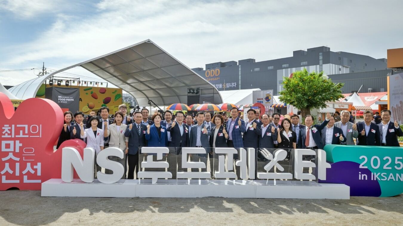 지난 26일 전북 익산시 하림 퍼스트키친에서 열린 ‘NS푸드페스타 2025 in 익산’ 개막식에서 주요 인사들이 성공 개최를 기원하며 엄지손가락을 지켜 세우고 있다. 익산시 제공 조항목 NS홈쇼핑 대표는 “NS푸드페스타는 농가와 소비자, 청년 인재, 글로벌 스타트업이 함께하는 상생의 장”이라며 “K-푸드의 신선함과 가치를 세계에 알리고 지역 경제 활성화에 기여하겠다”고 밝혔다. 정헌율 익산시장은 “시민·기업·행정이 함께 만든 성과로, 익산이 세계적 식품산업 도시로 도약하는 발판이 될 것”이라고 말했다.