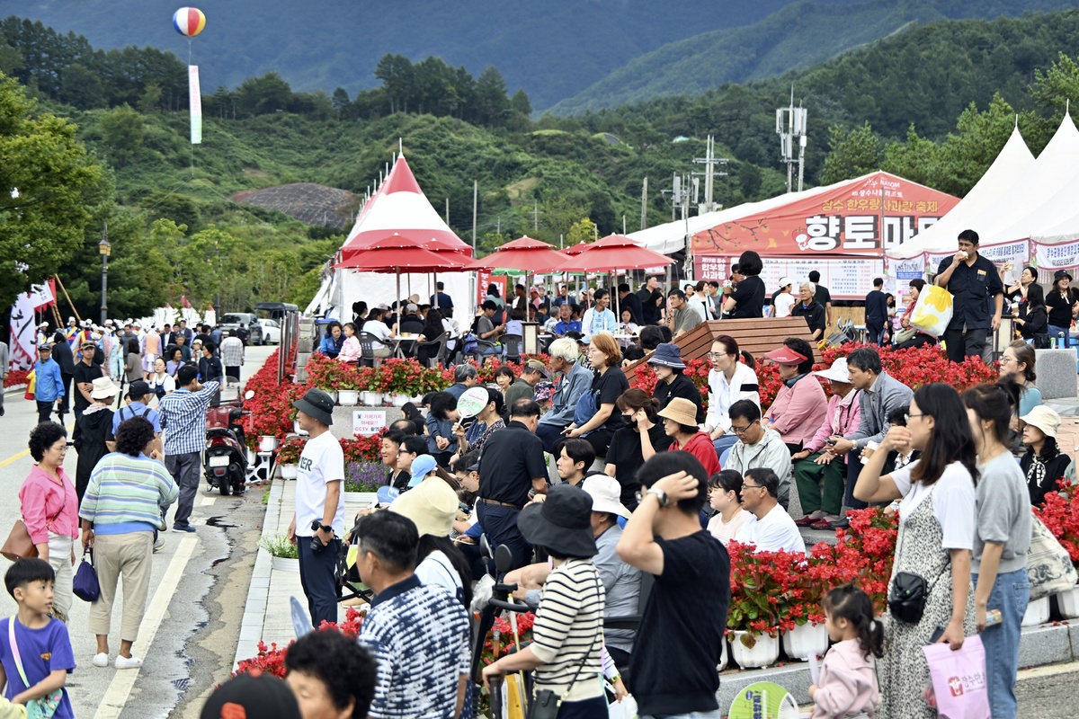 지난 18일부터 21일까지 전북 장수 의암공원 일원에서 열린 제19회 장수한우랑사과랑축제장이 수많은 참여객으로 북적이고 있다. 장수군 제공 한편, 지난 18일부터 21일까지 나흘간 전북 장수에서 열린 ‘제19회 장수한우랑사과랑축제’ 방문객은 32만여명으로 집계됐다고 장수군이 이날 밝혔다. 이는 지난해 30만명보다 2만명(7%)가량 증가한 역대 최대 규모였고, 입점 부스들의 매출액도 30억원을 돌파하며 사상 최고치를 경신했다. 한우랑사과랑축제는 장수 특산물인 사과, 한우, 오미자, 토마토 등을 널리 알리기 위한 행사로, 올해는 레드푸드 음식 만들기와 즉석 한우 구워 먹기 등 58개 프로그램이 진행됐다.