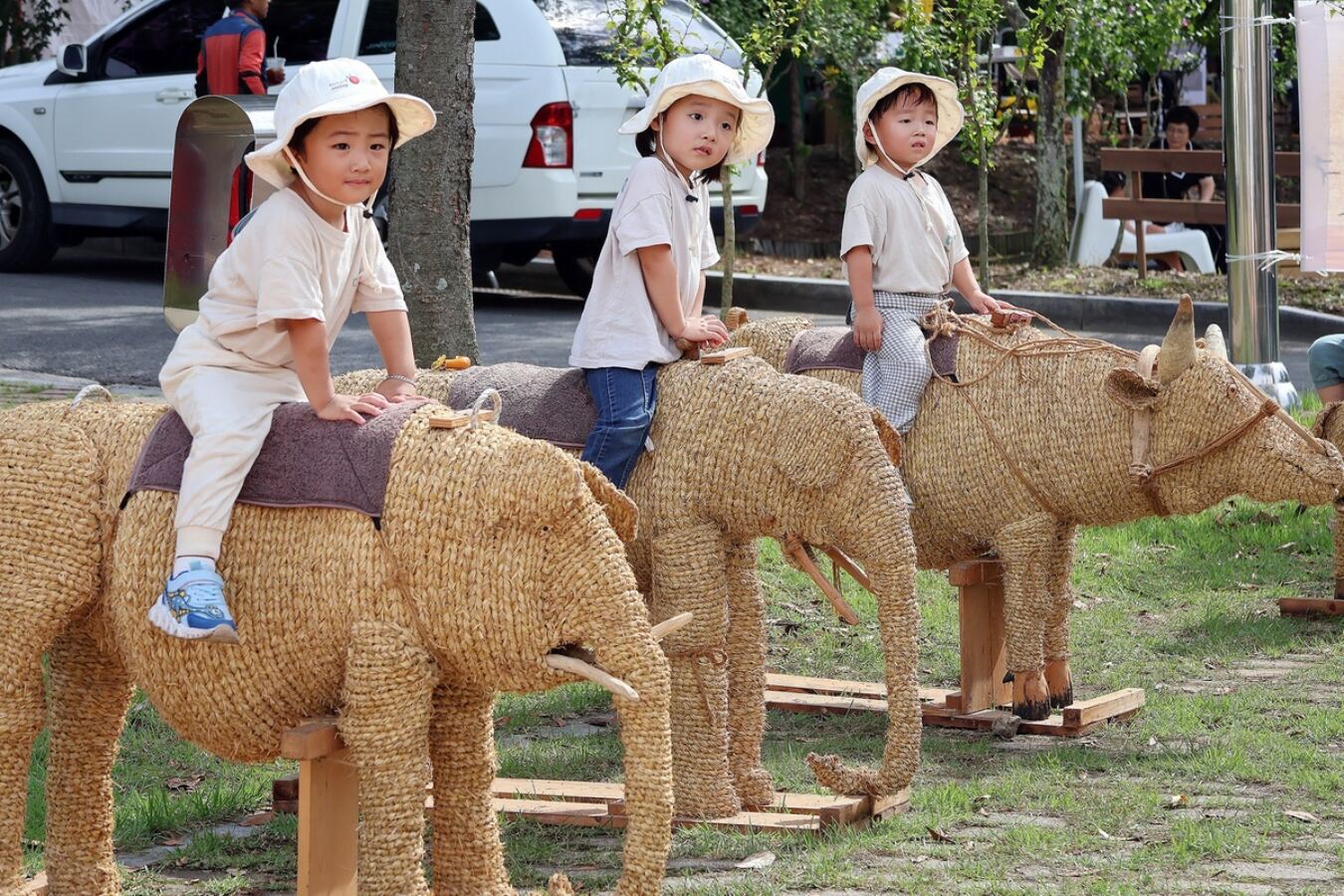 제13회 완주 와일드&로컬푸드축제를 찾은 어린이 방문객들이 짚으로 만든 코끼리 등 동물의 등에 올라가 사진을 찍고 있다. 완주군 제공 이 밖에도 김희재, 하하&스컬, DJ 아스터, 황민우·민호 형제, 현진우 등 인기 가수들의 무대가 흥을 돋우며 세대가 함께 어울리는 공연도 이어졌다. 축제장을 찾은 관람객들은 로컬 장터에서 완주 특산물을 구매하며 지역 농가와 소통했다. 한 농가 관계자는 “완주의 맛과 정성을 알릴 수 있어 기쁘다”며 품질 좋은 농산물 준비를 다짐했다.