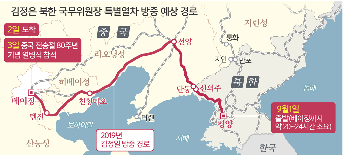 김정은 북한 국무위원장이 3일 중국 베이징에서 열리는 ‘중국 인민 항일전쟁 및 세계 반파시스트 전쟁(제2차 세계대전) 승리’(전승절) 80주년 열병식 참관을 위해 1일 오후 전용열차로 평양을 출발한 것으로 전해졌다. 대북 소식통은 이날 “김 위원장이 열차로 평양을 출발해 이동 중인 것으로 안다”고 말했다. 김 위원장을 태운 열차는 이날 밤 북·중 국경을 통과해 2일 베이징에 도착할 것으로 예상된다.