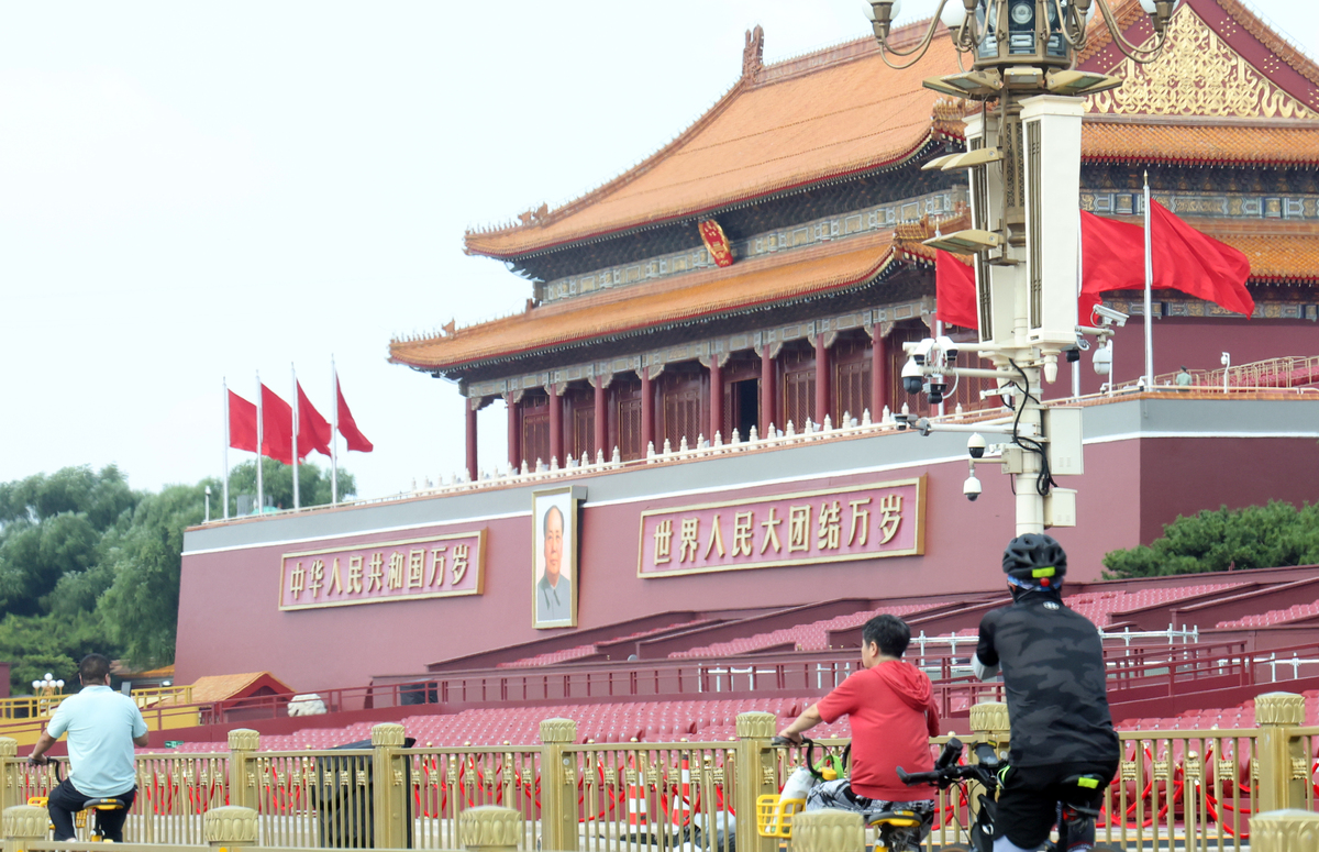 8월 31일 중국 베이징 천안문 앞으로 자전거를 탄 행인들이 지나고 있다. 베이징=뉴스1 열병식을 취재하려는 각국 기자들의 움직임은 분주해지고 있지만 할 수 있는 것은 많지 않다. 열병식 당일에도 당국이 배정한 지정석 외에는 접근이 불가능하다. 열병식이 열리는 창안제 인근에 사무실이 있는 경우 사무실 출입도 제한됐다. 관련 정보를 어떻게든 통제하겠다는 의지를 읽을 수 있는 대목이다. 김 위원장의 방중이 임박하면서 긴장감은 한층 높아졌다. 베이징 주재 북한대사관은 ‘최고 존엄’ 맞이에 분주했다. 건물 옥상에 새 장식물을 놓았고, 게시판에는 김일성 주석의 젊은 시절 사진을 걸었다. 김 위원장 전용열차 도착지로 예상되는 베이징역 주변은 무장 경찰이 경계를 강화했다.