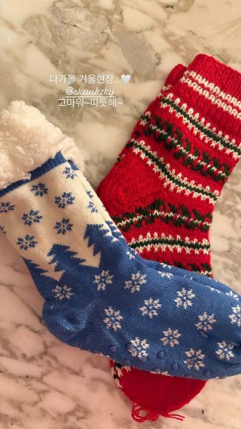 송혜교가 게재한 사진은 수면 양말 두 켤레로, 쌀쌀해진 날씨에 수지가 송혜교를 위해 선물한 것으로 보인다.